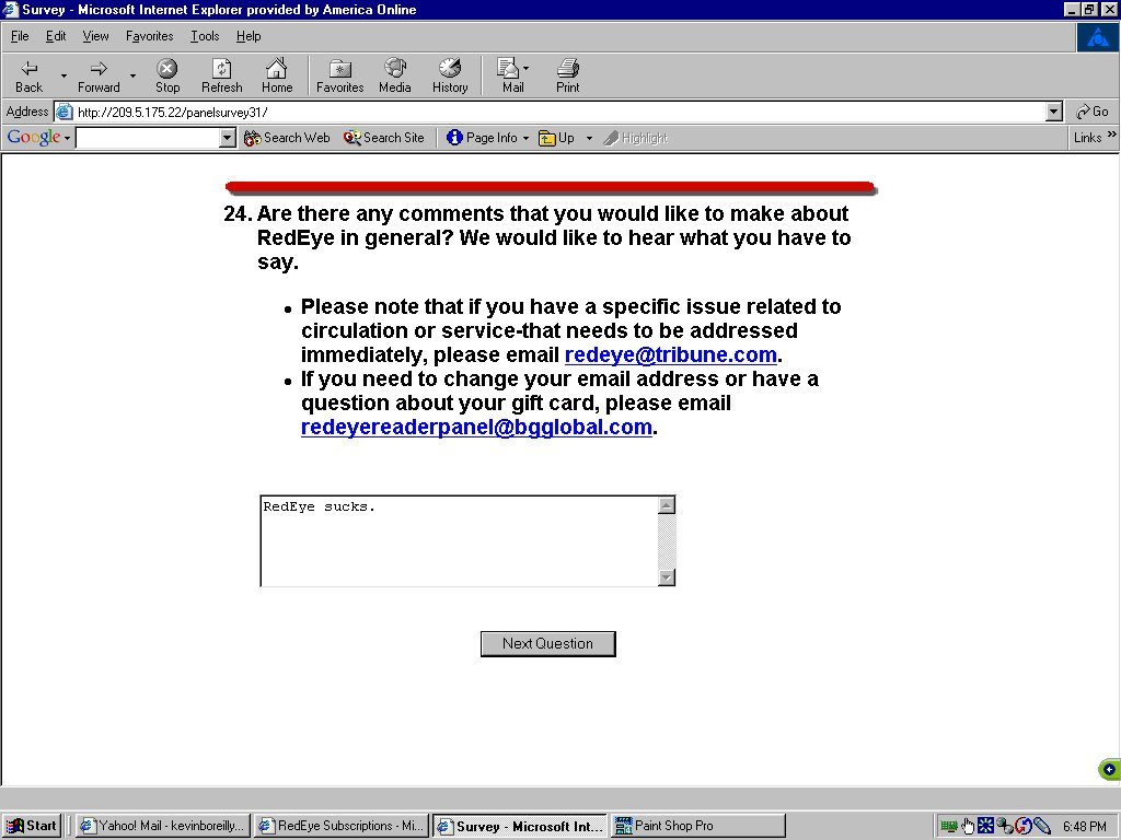 I received in reply an invitation to join the RedEye reader panel. Every week or so, I receive via e-mail a password to participate in the latest survey. They ask questions about the latest issue, how often I read RedEye, how much money I make, etc.
